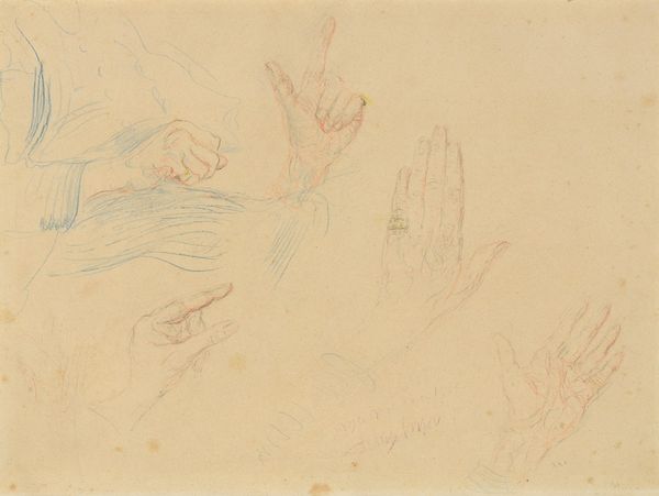 This red chalk drawing titled "Studies van handen" was created by Bernard Picart around the late 17th to early 18th century. Here, Picart captures hands in various actions: the delicate act of threading a needle, the gentle clasp of one hand within another, and the resting hand, fingers slightly curled. The hands are a microcosm of human expression. The motif of clasped hands, for example, can be seen as a symbol of unity and peace. Think of ancient Roman depictions of Concordia, where clasped hands signified harmony and agreement. In a funerary context, clasped hands can represent a final farewell or a bond that transcends death. There's an emotional depth here, too. Hands are our instruments of action, yet they also convey vulnerability, tenderness, and connection. They reveal the artist's close observation and sensitivity to the human form, and his understanding of the ways in which we communicate and interact. The recurring symbol resurfaces with each gesture, evolving with new meaning.