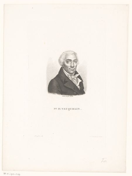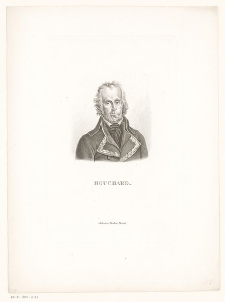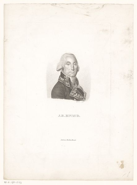 Curator: Take a look at this finely rendered engraving, created circa 1818 by Charles Aimé Forestier. It's titled "Portret van Jean-Charles Pichegru," depicting the French general. Editor: Hmm, imposing! The fellow looks every bit the serious military type. Austere. Like he's permanently waiting for bad news, despite that bit of powdered hair trying for a flourish. Curator: The portrait definitely captures the Neoclassical aesthetic. Look at the emphasis on clean lines, rational composition, and how the artist employed a somewhat cool, restrained emotional tone. These were hallmarks of the era, particularly in portraiture designed to convey a sense of order and authority. Editor: Cool and restrained alright, though those chevron details all over his jacket and collar feel kind of like he’s been caught in a knitting mishap. All that zig-zag action undercuts any impression of warmth. It gives a sort of frantic energy under the official demeanor, maybe he’s a schemer? Curator: That might be pushing it! Although printmaking allowed for dissemination and wider visibility, engraved portraits were important tools for shaping public perceptions of important people, as it emphasizes a general's strength. Editor: Shaped or flattened! It does sort of sanitize away personality though. Like they sanded away all the interesting bits, all the humanity until there's only heroic… outline. Even though the details are gorgeous, don't get me wrong. You can almost feel the linen of his jacket through the image, the weight of that fabric, and that's remarkable in a way. Curator: Agreed. It provides insight into how society wanted to immortalize individuals they deemed noteworthy. Pichegru had a complex history, oscillating between triumph and allegations of treason, which makes the composition a little...complicated. Editor: Ah, a troubled soul wearing too many zigzags, preserved for eternity. What better image for a complicated man, really? Maybe the coldness of the image adds layers instead of diminishing him after all... Curator: An excellent point, prompting reflection on permanence. Editor: And how easy it is to leave the zig-zags and start perceiving shapes, the outline of the person inside. Let’s keep walking?