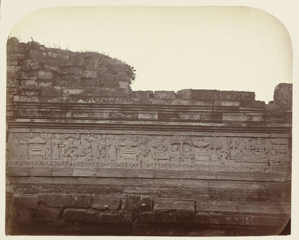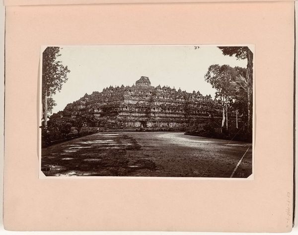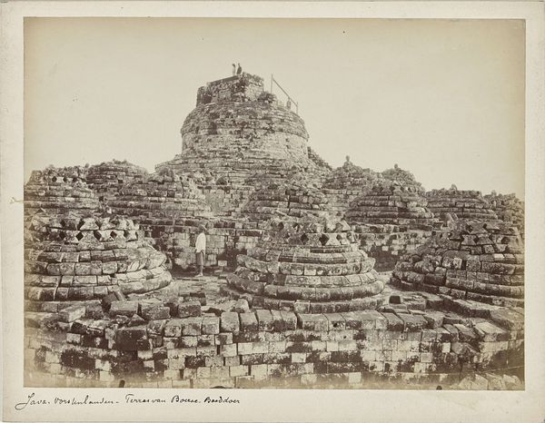 Editor: This photograph, taken between 1895 and 1915 by Otto Hisgen, shows Borobudur in Java, Indonesia. It’s a gelatin-silver print, giving it this stark, almost ghostly quality. What do you make of it? Curator: It’s fascinating to consider this image through the lens of its historical context. This photograph exists as Dutch colonial power in Indonesia was consolidating. The "discovery" and subsequent restoration efforts of Borobudur were, in many ways, intertwined with that colonial project. Editor: So, this image isn't just a neutral documentation of the site? Curator: Precisely. Photography itself became a tool for the colonial administration. Think about it: this image, taken by a European, is circulated back to Europe, shaping the Western perception of this Southeast Asian monument. How does the framing itself, this sort of distanced perspective, influence that perception, do you think? Editor: I see your point. It creates a sense of the monument as something to be observed, almost possessed, from afar, rather than something to be experienced. Curator: Exactly. And we need to ask ourselves: what narratives were being constructed, and for whom? This image, seemingly objective, played a part in the colonial gaze. What did you notice when you first viewed it? Editor: It looks like there are few people. It seems remote and lonely to me. This made the monument stand out more. I see that now in a new light. Curator: Exactly, this adds another layer to consider about how the cultural institutions were shaped by colonial projects in that era. I find it amazing to delve deeper.