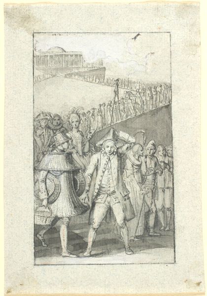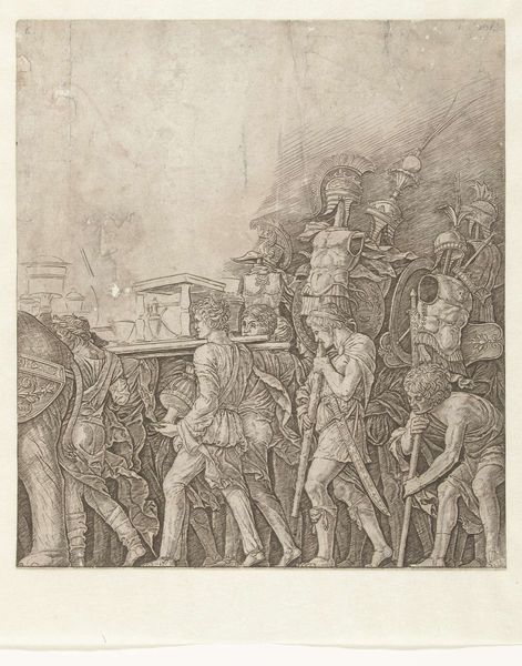 Editor: So, here we have Mantegna's "Senatoren in triomftocht van Julius Caesar," created sometime between 1486 and 1492. It’s an engraving, so the detail is just amazing. It definitely feels like it's trying to capture the grandeur of ancient Rome. What strikes you most about it? Curator: Immediately, it's the echoing symbolism of triumph. Consider the wheat stalks carried by the soldiers—fertility, abundance, Caesar as provider. What feelings do these repeating triumphal images conjure, connecting us back to the ancient world? Editor: I hadn’t really thought about the wheat, I just thought it was some random decorative element. I guess it’s supposed to suggest a kind of golden age or something like that? Curator: Precisely! The layered composition contributes, too. Figures both ancient and contemporary. They create not only an historical tableau but also cultural continuity, and shared identity between the viewer and this imagined past. Does it inspire thoughts of the Roman ideal influencing the Renaissance? Editor: Yes, I can see how Mantegna tries to use Roman ideals and connect them with Renaissance imagery to create this sort of golden ideal. But is it nostalgia or something else entirely? Curator: Perhaps a call to revive Roman virtue. The Senate marching in seeming perpetuity suggests eternal power. But does the somewhat stiff depiction of figures also indicate underlying unease, or rigidity of power? What does it say to you? Editor: I see your point, perhaps it's an almost unsettling sense of order that contrasts against any kind of true power. Looking at all these figures compressed within the frame has been enlightening. Curator: Indeed! The artist's hand reveals not only history, but cultural memory that speaks to this very day.