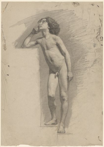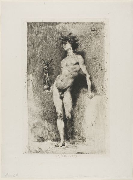 Mariano Fortuny Marsal created this etching, Male nude with victory symbol in his hand, using a network of fine lines to produce a range of tones and textures. The figure's pose, leaning casually against a support, presents an interesting study in contrapposto, a classical technique used to convey a sense of relaxed naturalism. Notice how Fortuny uses line weight to define the contours of the body, creating volume and depth. The etching technique allows for a remarkable level of detail, especially in the rendering of the figure's hair and musculature. The victory symbol held by the figure introduces a layer of symbolic complexity, inviting speculation about the relationship between physical form and abstract ideals. Through the visual language of etching, Fortuny explores the interplay of form and content, challenging viewers to consider the multiple layers of meaning embedded within this seemingly straightforward representation.