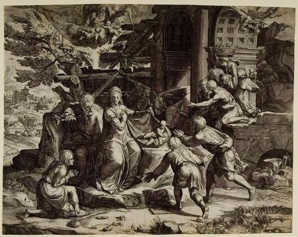 Curator: Theobald Reinhold Freiherr von Oër's "Kidnapping of Ernst and Albert, sons of Frederick of Saxony, from the Castle at Altenburg"—what strikes you first about it? Editor: Chaos, definitely. It feels crammed, like a nightmare unfolding in a dollhouse. Curator: Yes, the composition is quite dramatic. Note how Oër uses the strong diagonal lines of the doorway and the bed to create a sense of urgency. The monochrome palette adds to the severity of the scene. Editor: It makes me think about vulnerability, a child’s bedroom invaded like this. And that poor scholar at his desk, totally blindsided! Curator: The artist really captures the surprise and the violation. One can almost feel the chill and fear. Editor: Absolutely, it’s like stepping into a dark bedtime story. Oër really understood how to make history resonate on a visceral level. Curator: Indeed, a powerful snapshot of a tumultuous past.
