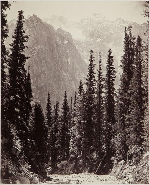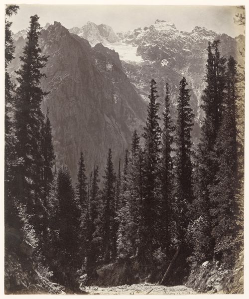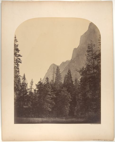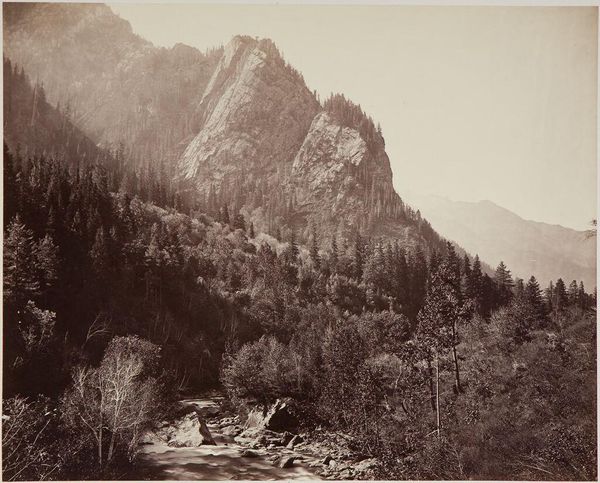 Editor: This gelatin-silver print, titled "General View of Yosemite," was created between 1870 and 1874 by Carleton Watkins. The texture of the stone feels so tangible, yet the overall tonal range gives it a dreamlike quality. What are some of the visual cues you see that stand out? Curator: The composition is masterful in its deployment of light and shadow. The stark contrast between the illuminated cliff face on the right and the more diffused background establishes a visual hierarchy. Note how Watkins guides the eye not through narrative content but through tonal relationships and the sheer materiality rendered in gelatin silver. What does the play of light and dark communicate to you? Editor: I guess the texture and shading definitely add to the drama, maybe even making it feel… sublime? But I hadn’t thought about how purposeful the use of light must have been. Curator: Precisely. The placement of that waterfall and wispy clouds in the distance adds a soft element to an otherwise austere vista. By modulating these components, Watkins creates a complex interplay. Notice how this is an essay in tonal graduation, and also, repetition; see if you can chart out all the repeating verticals! Editor: That makes me appreciate the organization more. Focusing on the relationship between visual elements adds to the understanding. Thanks! Curator: Indeed. By attending to the formal properties, we’ve unpacked another dimension of experience contained within.