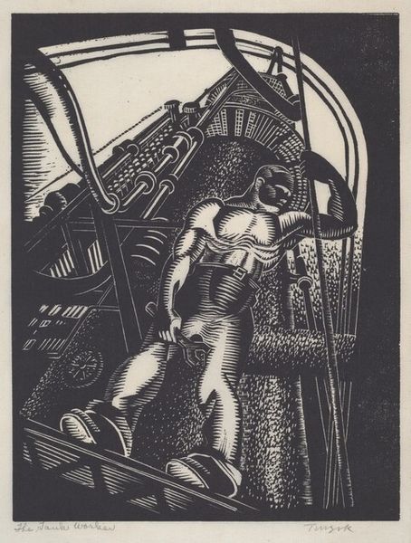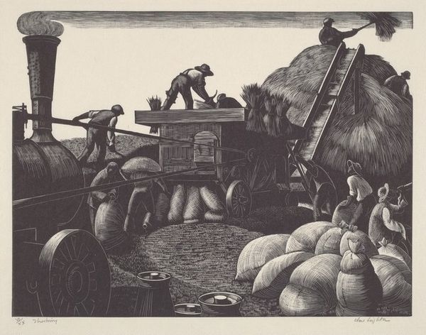 Editor: Clare Leighton's woodcut, "Apple Picking" from 1932, really grabs my attention with its bold use of black and white. The figures working amongst the apple trees create this feeling of communal labor. What is your take on this work, given the context of the time? Curator: It's a powerful piece. Leighton’s woodcuts often romanticize rural labor, but it's important to consider the context. The 1930s was a time of economic hardship, and there was a rise of social realism in art. How might Leighton’s image function as propaganda, or perhaps social commentary? Editor: I see what you mean. I hadn't really considered it beyond just a depiction of work. The idealized representation makes me question whether she's actively documenting anything other than a vision of community. What effect does this stylization create for viewers in different social and economic brackets? Curator: Exactly. The visual choices here become political. By simplifying forms and focusing on the activity, she potentially idealizes the lives of rural workers, maybe even to provide a sense of stability and continuity to those who are unemployed or insecure. The composition makes their activity look noble. Do you see any indicators in the way it’s composed that disrupt the "common" man, signs that make us acknowledge economic inequalities? Editor: I notice that although the style has hints of realism, there are some discrepancies and simplification when one truly focuses. Is that a form of rhetoric that the image can weaponize? Are the workers intended to reflect other classes of people as well? Curator: Yes, it absolutely is. Art isn't just reflective; it’s an active participant in shaping ideologies. By using certain aesthetics or choosing specific perspectives, "Apple Picking" can work as an ideological project reflecting or shaping people’s perceptions and beliefs on labor, the society, the economy, etc. Editor: This is such a fascinating perspective. It changes how I see not just this print, but art with a message generally. Curator: Indeed. Hopefully you’ll think twice about the ways art plays on social consciousness going forward.