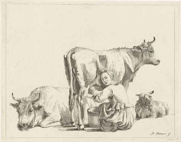 Editor: This drawing, "Vrouw die een geit melkt," or "Woman Milking a Goat," by Jean Bernard, made sometime between 1775 and 1833, is a simple pencil sketch, but it feels surprisingly intimate. What do you see in this piece, in terms of how images connect us to history and culture? Curator: I see echoes of ancient pastoral scenes, a continuity of human interaction with animals and the land. Consider the goat: it's a complex symbol, linked to sustenance, but also to wild, untamed nature. Notice how the woman's posture suggests both vulnerability and authority. It reflects a traditional female role, of course, but what other visual cues speak to deeper meanings for you? Editor: The way the light falls, almost romantic, it feels staged, like a genre scene, but her downcast gaze is anything but glamorous. Curator: Exactly. That contrast speaks volumes. The "everydayness" is carefully constructed. Are there classical memories woven into the idealized landscapes? What does it mean to idealize agricultural labour in the 18th and 19th centuries? Editor: So, even a seemingly simple sketch can hold layers of cultural and psychological weight? I hadn't considered that. Curator: Absolutely. These images are rarely simple. They resonate across time because they touch upon fundamental aspects of the human experience. Always ask yourself, what memories, stories, and beliefs does this image awaken? Editor: It's fascinating to think of how seemingly ordinary images connect us to broader cultural narratives. I'll definitely be looking at art differently from now on! Curator: Indeed! Recognizing these subtle connections helps us engage more deeply with the artwork and its enduring cultural power.