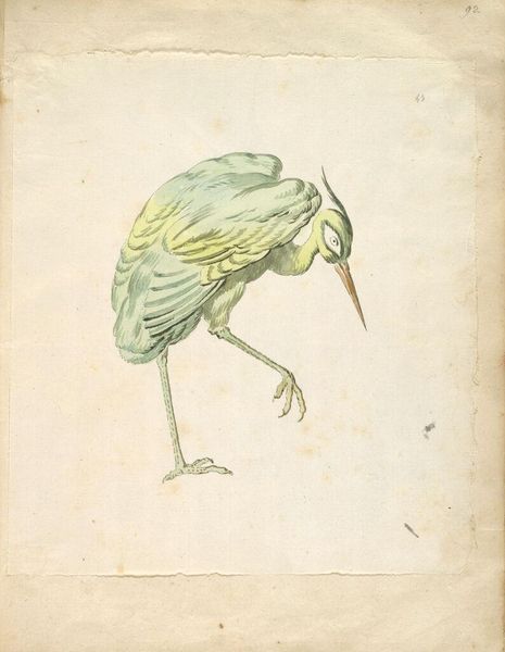 Curator: Look at this delicate drawing, Two Herons by Jean-Baptiste Oudry. The size is roughly 33 by 30 centimeters, making it an intimate study. Editor: My first impression is one of fragility. The pale washes and thin lines give it a sense of vulnerability, as if these elegant creatures might vanish. Curator: Oudry was deeply involved in the material culture of the French court. He designed tapestries, and we see here the same meticulous attention to detail, rendered in watercolor and graphite. Editor: Yes, but consider the formal elements. The overlapping of the herons creates depth, while the muted palette unifies the composition. The textures, achieved through subtle washes, create a visual harmony. Curator: And these herons, symbols of vigilance, reflect the court's interest in natural history and exotic creatures, objects of both aesthetic admiration and status display. Editor: I appreciate the way the artist captured their physical structure, emphasizing the beauty of the bird's natural form. It's a very refined and striking study of form. Curator: Oudry’s focus on the herons’ form can be understood within the larger context of Royal patronage and what it meant to produce images of prestige. Editor: Seeing these herons together certainly offers a different perspective on art of the French court. Curator: Indeed, it reveals the intersection of art, nature, and power.