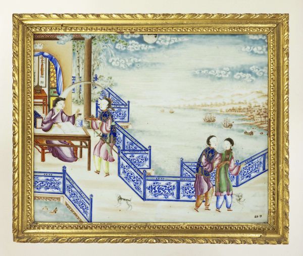 Curator: This watercolor illustration, painted around 1770-1775, is titled "Plaque Depicting a Mandarin's Visit." It's currently housed here at the Rijksmuseum. Editor: It strikes me as both formal and intimate. The detail is exquisite, almost miniaturist in its precision, yet the scene itself feels like a private moment observed. There's an interesting tension there. Curator: Absolutely. These genre scenes were often created for export, catering to European tastes fascinated by the exoticism of the East. The Mandarin, his robes suggesting status and authority, is the focal point, but everything around him speaks to the complexities of 18th-century Chinese social rituals. Editor: Look at the Pheasants. Are they meant as trophies or pets? Then there are the flowers. Every object in the room looks calculated. What would a painting such as this convey to someone within its original cultural context? Curator: Well, the Mandarin himself would likely read it as a validation of his status, a representation of the smooth functioning of his household, perhaps even an invocation of good fortune. The gifts offered, though subtly rendered, reinforce the power dynamic. It's about displaying and confirming hierarchical order. Editor: And to European viewers? The architecture itself must have appeared novel. All the colors are very restrained and muted, except for the Pheasants' bold markings which adds some flair and an unexpected touch. It is interesting to wonder how accurate are those representations... Curator: The presumed "accuracy" often served only to perpetuate an idealized image of China, carefully crafted for the European gaze, filled with symbolism not entirely grasped by its audience. They may or may not be accurately portraying a specific person or interior but instead creating an idea. Editor: Which, in itself, becomes a historical document – not of a reality, but of a perception. A visual record of cultural exchange, rife with assumptions and interpretations, reflecting both the subject and the observer. Curator: Precisely. Its value resides not just in its aesthetic qualities but also as a historical marker, illuminating the intricacies of cross-cultural interactions and the enduring allure of the "other." Editor: It definitely has given me some food for thought around the impact imagery and artistic representations can have over history.