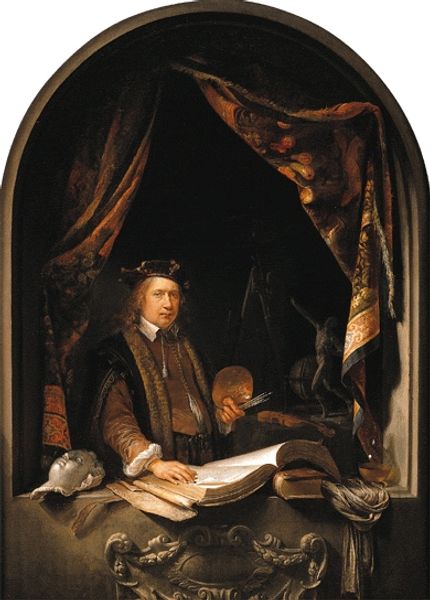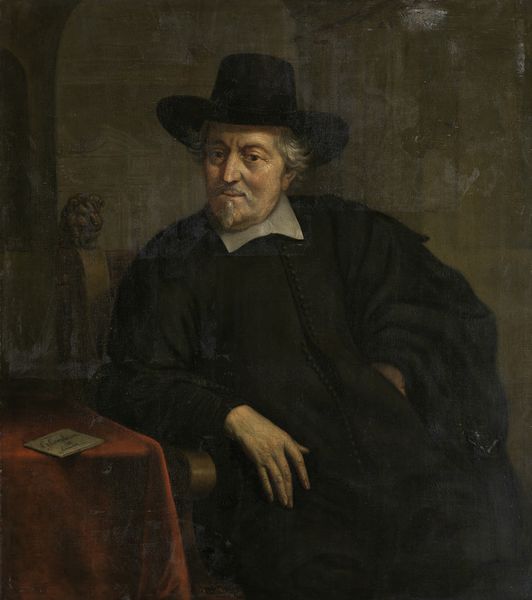 Editor: Here we have Abraham van den Hecken’s portrait of Cornelis Jansz Meyer, a hydraulic engineer, painted between 1650 and 1655. It's quite a serious and imposing portrait; the composition is very still and staged. How do you interpret this work? Curator: This portrait offers a powerful insight into the intersection of intellectual prowess and societal position in the Dutch Golden Age. Consider the symbols around Meyer: the globe, the book opened to technical drawings, even the skull. They speak not just to his profession, but to a worldview that intertwined scientific advancement with a keen awareness of mortality and global engagement. How do you think the choice of these specific objects might have shaped how Meyer was perceived, both then and now? Editor: I suppose these items were selected to represent his profession, but could these have also carried symbolic importance relating to colonialism and trade? Curator: Precisely. The globe, while representing knowledge, also hints at Dutch colonial ambitions and the exploitation of resources and people. Meyer’s work, reclaiming land from the sea, can be viewed as an act of reshaping the environment, similar to how colonial powers reshaped societies. Does this reading change your initial perception of the portrait’s “seriousness?" Editor: Yes, it adds a layer of complexity. It makes me wonder about the ethical dimensions of his work within the context of his time. Curator: Exactly. By engaging with the historical and social context, we see that art isn't separate from the issues of its time. It's a reflection, sometimes a critical one, of power structures and ideologies. Editor: I see now that art provides insights into the prevailing social and cultural circumstances during its creation. Thanks for the in-depth view! Curator: My pleasure! It's a continuous dialogue, reshaping our perspectives through historical understanding and social awareness.
