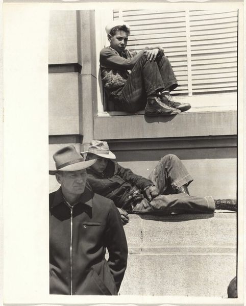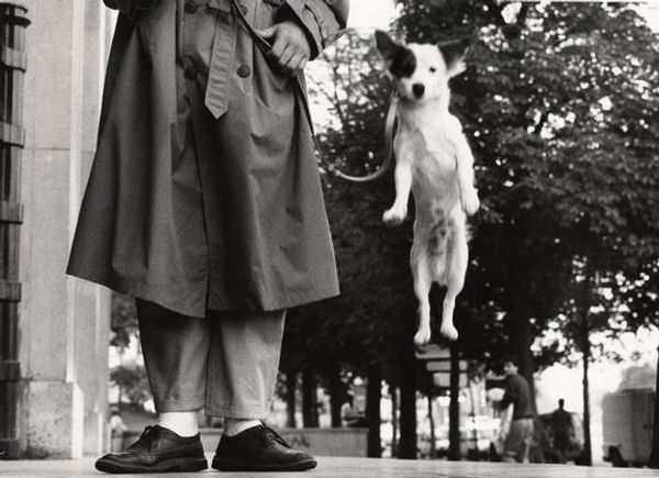 Robert Frank's photograph captures a candid moment in San Francisco, using a stark monochrome palette that heightens the textural contrast between the rough street and the smooth wall. The composition, dominated by strong verticals, features a man elevated on a cylindrical object, juxtaposed with a dog seated at its base, creating a visual hierarchy and a sense of surreal elevation. The framing emphasizes the interplay between permanence and transience, with the architectural backdrop contrasting the informal poses of the man and dog. The photograph disrupts conventional perspectives through its unconventional subject arrangement, prompting a semiotic interpretation of the elements. The man's elevated stance challenges notions of status, while the dog's subdued posture introduces a counterpoint of humility. Frank subtly destabilizes fixed social meanings by positioning everyday figures in unexpected contexts. Through its careful arrangement of forms and textures, this image functions beyond mere representation, engaging with broader questions of perception, power, and representation within the urban landscape.