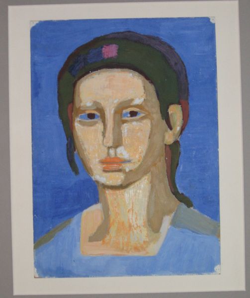 Curator: Immediately striking, isn't it? There's a fragility here, a gentleness, but with unexpected bold colours. Editor: This watercolor and ink work, "Orans," by Hryhorii Havrylenko, dates from 1982. It clearly nods to the medieval, both in style and theme. The 'Orans' pose is a classic posture of prayer. Curator: You can definitely sense the hand of the artist in the application of the watercolor. It seems almost raw, a direct translation of feeling to paper, rejecting traditional oil practices for these fluid mediums. Editor: Its figuration seems intentional, echoing byzantine art in its geometric forms. I think of its context. 1982, during a specific period within Soviet Ukraine. How might that period and geography shaped its imagery? Curator: That restriction perhaps informs his choice to focus intensely on colour and form. Looking closely, I love how the red interacts with the blues. Notice too the way he's built up layers, creating a luminous effect especially with the hands raised, drawing attention. I’m especially taken by how those colors interact with the production and the available materials for Ukrainian artist during Soviet era. Editor: Absolutely, the limited color palette perhaps becomes a strength, highlighting resourcefulness. The choice to emulate an 'Orans' pose is loaded, maybe conveying longing and seeking spiritual refuge through the figure. Considering the public life of Ukrainian art at the time, its private meaning deepens. Curator: In his choice of watercolor and ink rather than conventional artistic process there’s also the creation of sacred labor through art practice within restriction, allowing both intimate devotion. Editor: The socio-political constraints arguably elevate the symbolic nature of such choices within a specific public context. Art history provides that deeper understanding, that historical positioning which enhances meaning. Curator: Seeing his creation process reminds us to explore these art-historical approaches through practice; an active material engagement where, to feel with is to think with. Editor: Exactly. This has offered insight not just into its appearance and making but on Havrylenko's relationship with spirituality.