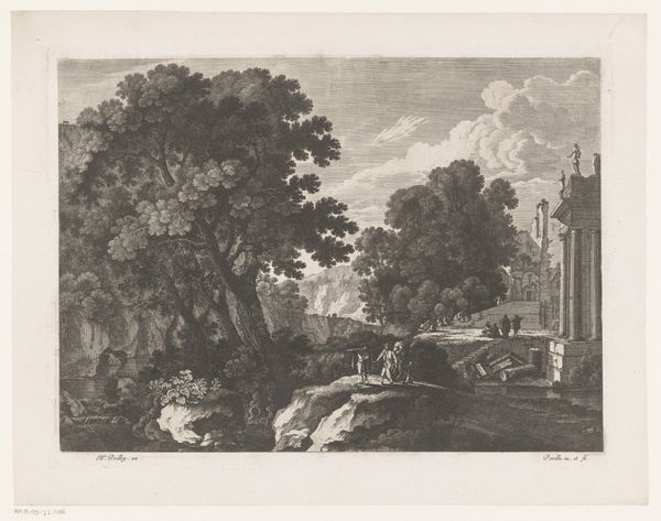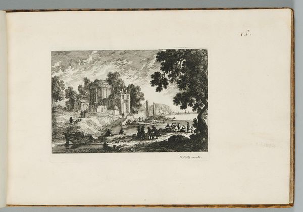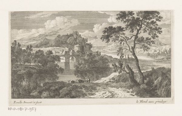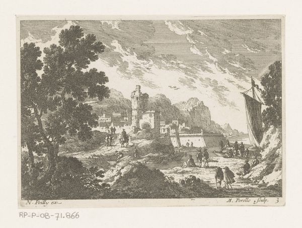 Nicolas Perelle created this print, 'Landschap met inladen van boot', which translates to 'Landscape with loading of boat' in the 17th century. The print was created with engraving, a process that involves cutting lines into a metal plate, applying ink, and then pressing paper against it. Looking at the artwork, you might notice the level of detail achieved with the use of fine, precise lines, that capture textures from the sky and water to architectural features and figures. The engraver's skill is evident in the controlled modulation of line thickness and density, used to create depth and shadow. Engraving was a painstaking process, requiring extensive training, patience and a steady hand. The technique was often used for reproducing existing paintings. This print, with it's serene landscape and busy dock, reflects both the artistic skill of the engraver and the labor involved in producing and trading prints, revealing a glimpse into the commercial art world of the period.