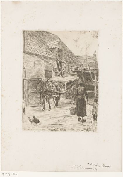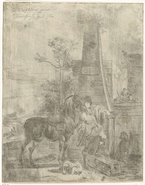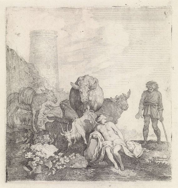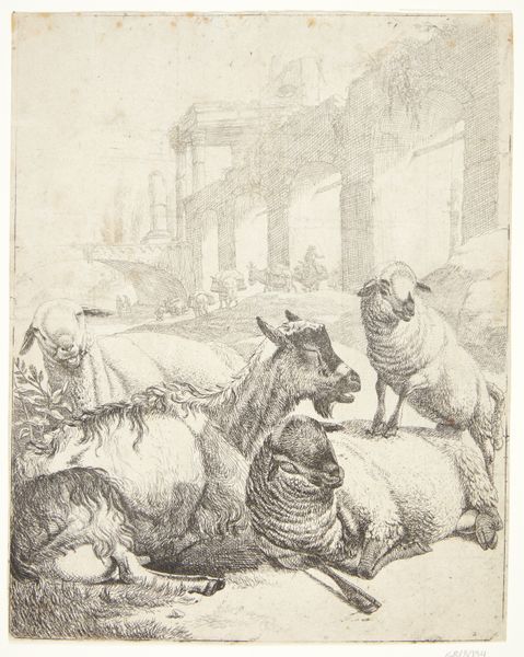 Johann Heinrich Roos created this etching of two lying sheep, a lying goat, and a standing lamb near a Roman aqueduct in the 17th century. Roos, a German artist, specialized in animal depictions, a genre that gained popularity as cities grew and people became more distanced from rural life. This etching invites us to reflect on the relationship between humanity and nature, and the idealized pastoral scenes that were in vogue at the time. Here, the animals are not merely subjects, but seem to exist in a dialogue with the ruins of the aqueduct. Roos subtly comments on the transience of human endeavor against the backdrop of the natural world. He places a certain emotional weight on the animals. They are emblems of innocence and simplicity, perhaps critiquing the complexities of human society. The aqueduct in the background stands as a symbol of human ingenuity but also of decay, reminding us of the ephemeral nature of civilization. Roos’s work encourages us to consider our place within the larger ecosystem.