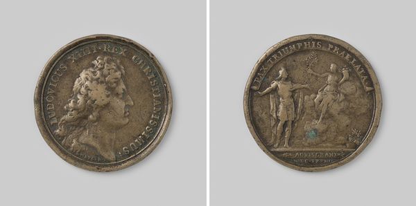This bronze medal, made by Gerard van Bylaer, commemorates a pivotal moment. The medal’s circular form contains dense imagery and text, typical of the 16th century. The raised relief and the texture of the bronze invites tactile exploration. The medal's composition revolves around two distinct scenes, each occupying one side of the disc. On one side, a figure stands beside a lion, symbols of power and authority. The reverse shows a figure repelling another with a whip. The choice of bronze as a medium grounds the medal in a historical context, referencing ancient traditions of commemorative objects. The inscriptions, rendered in a classical typeface, frame the imagery, adding a layer of textual meaning that interacts with the visual elements. This medal doesn't merely depict an event, it actively participates in shaping its memory. The contrast between the figures and their actions creates a dynamic visual narrative. By examining these formal qualities we can better understand the complex interplay between art, power, and representation in the early modern period.