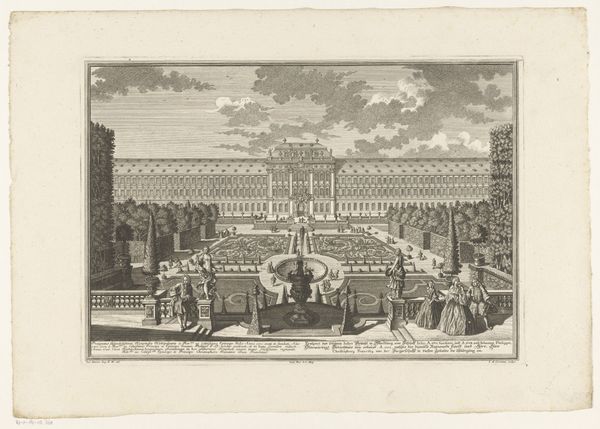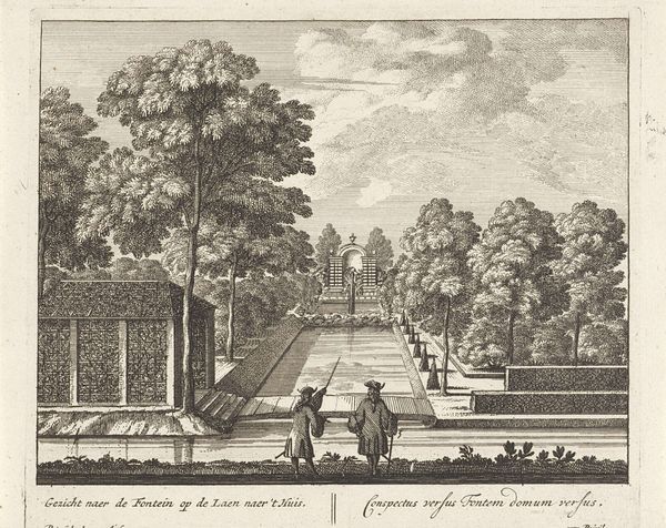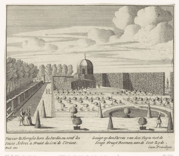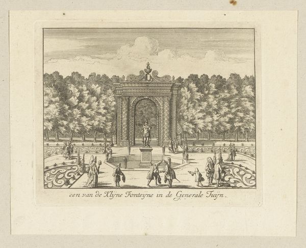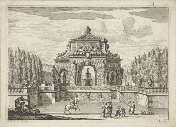 Editor: This is "Fountain in the gardens of the Villa d'Este at Tivoli," an etching and engraving by Giovanni Francesco Venturini, created sometime between 1653 and 1691. It feels very ordered, almost staged, despite depicting an outdoor space. What stands out to you as a historian? Curator: It’s a fascinating portrayal of power through landscape, isn't it? Look at how Venturini renders the gardens. It's not just a pretty view; it's a statement about control and the imposition of order onto nature. Do you notice how the print emphasizes the artificiality of the landscape with those regimented fountains and precisely trimmed hedges? Editor: Yes, the strict lines are hard to miss! What does that suggest about the role of gardens back then? Curator: Gardens, especially those like at the Villa d’Este, were visual declarations of wealth, status and authority. It demonstrated one's ability to command resources, both natural and human, to realize such an elaborate space. This print then serves as a kind of propaganda, disseminating this image of power to a wider audience. Think of the Renaissance idea of the "ideal city," but translated into landscape. What purpose do you think prints like these served in circulating such imagery? Editor: It’s like social media for the 17th century! Showing off and influencing others, creating trends of taste, spreading socio-political agendas by those in power… Curator: Precisely! And it’s not just about the aristocracy; it’s about crafting and shaping a very specific idea of Italian grandeur for a European audience. By understanding that prints like these circulated widely, we gain a deeper insight into the aspirations and the image that Italian elites wished to project onto the global stage. It allows us to critically examine art’s public role and its influence on the creation and maintenance of socio-political structures. Editor: That’s incredible. I hadn’t considered how deliberately these images were crafted to convey so much more than just the beauty of a garden. Curator: Exactly. It reveals how landscape art can be read as a cultural and political text, shaped by and also shaping social power. Editor: Thanks! Now I'm looking at landscape art in a totally different way!