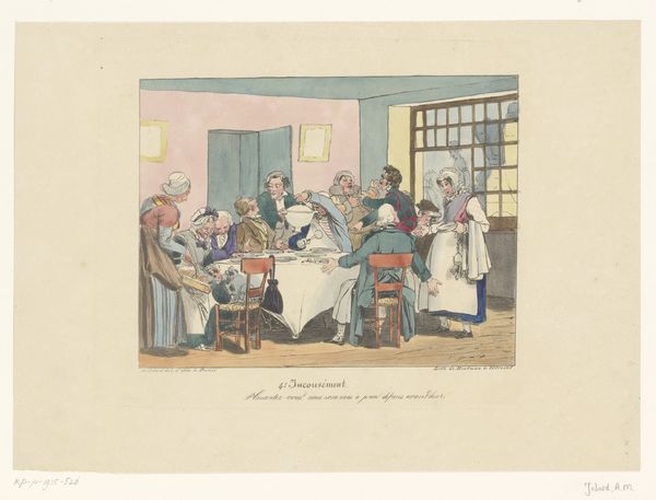 Editor: So, here we have Eugène-Louis Lami’s "Caricature. No. 5. Les Voisins de Campagne." made in 1828, a lithograph with watercolor. It strikes me as a snapshot of social dynamics, maybe a little mocking? What do you see in this piece? Curator: Well, it is more than just a mocking snapshot. It's a commentary on the emerging bourgeois class in post-Revolutionary France, wouldn't you agree? Lami is playing with ideas of leisure and social performance. Note the ways in which each figure is carefully constructed – their attire, their posture. Consider this from a gendered perspective. Editor: Right, the women are so elaborately dressed. Do you think there is an imbalance of power dynamic displayed in the artwork, then? Curator: Absolutely. It prompts questions about the societal expectations placed on women within this class structure. Were they merely decorative objects, symbols of their husbands’ success? What is absent from this setting? Editor: It does seem like there’s a real emphasis on appearance and social standing. No signs of labour or any actual connection. How can we relate this back to today? Curator: Consider how social media echoes similar performances of status and curated identities. The need for validation, the subtle hierarchies—it’s all still there, isn’t it? We are all neighbours engaging in social performance of some kind. Editor: I see what you mean. The print really reveals so much about that period, not just what people looked like, but also what their values were. Curator: Precisely, and hopefully it allows us to reflect critically on our own values and behaviours too. Art offers so many openings into different modes of thought.