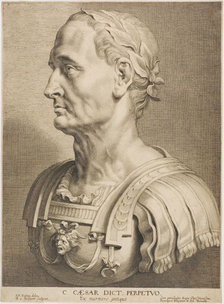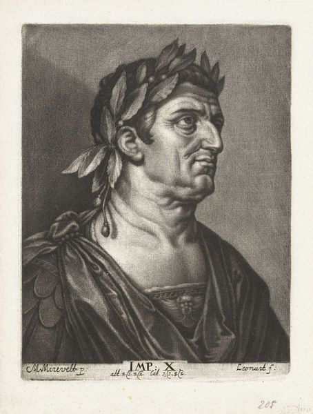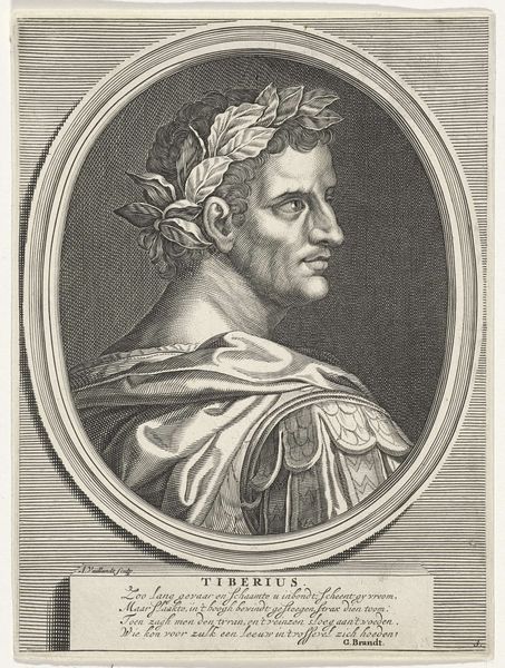 Andries Vaillant created this portrait of Julius Caesar using engraving techniques. The composition is dominated by an oval frame, within which Caesar is depicted wearing a laurel wreath. The artist employs a tight hatching to model the form, creating a play of light and shadow that gives depth to Caesar's face and drapery. Consider how the circular form of the wreath and frame creates a visual harmony, while the contrast between the detailed facial features and the smoother rendering of the toga directs our gaze. This formal approach, emphasizing line and form, aligns with the period's interest in classical ideals and their representation through controlled, structured compositions. The print functions as a sign, not just of historical representation, but also of cultural and philosophical values. The act of framing, combined with the detailed rendering, elevates Caesar, inviting viewers to contemplate themes of power, virtue, and historical legacy. The artwork, through its formal qualities, offers a space for ongoing engagement with these complex ideas.