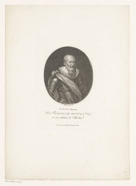 Editor: So, this is François Bonneville’s "Portret van John Locke," dating back to somewhere between 1796 and 1802. It's an engraving, a print on paper, of the famous philosopher. The figure looks dignified, but a bit… austere. What do you see in this piece, from a symbolic perspective? Curator: Indeed. Consider the symbolic weight of portraiture in that era, especially of Enlightenment figures. Locke is presented not merely as an individual, but as an emblem of reason. Note the Neoclassical style – a revival of classical aesthetics that favored order and clarity, mirroring the Enlightenment's emphasis on rational thought. Doesn’t that inform how you consider the print medium? Editor: I see your point. The clean lines of the engraving really emphasize that sense of order. But what about Locke himself? How is he specifically presented as an "emblem of reason"? Curator: His gaze is directed off to the side, contemplative rather than confrontational. It’s less about power, more about intellect. What emotions might that directionality evoke, linking to contemporary values about scientists and philosophical thinking? This style of presentation signals a continuity between classical wisdom and Enlightenment ideals, a lineage of thought. Editor: That's fascinating. So, it's not just a portrait of a man, but a carefully constructed symbol of an entire intellectual movement? Curator: Precisely! It serves as a visual embodiment of Enlightenment principles. And consider the deliberate use of print. Reproducible, accessible… What could that choice signal about the accessibility of reason itself? Editor: It's like they wanted to democratize knowledge! I'd never considered the medium itself as a symbol. Thanks for the new lens. Curator: Indeed, symbols offer rich perspectives. They weave tapestries of time, echoing history, thought, and aspirations through generations.