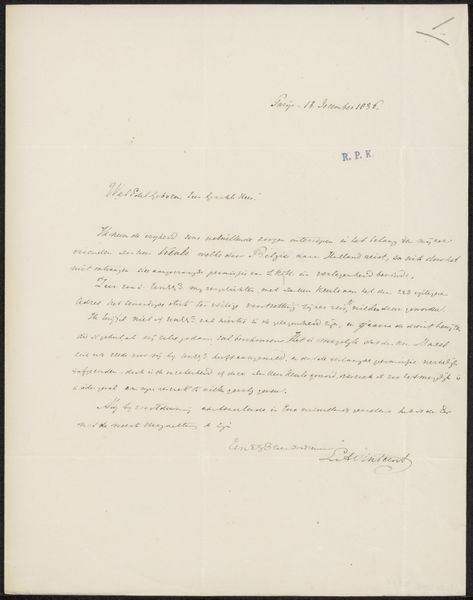 Curator: Here we have B. Verpoorten’s “Brief aan Lambertus Hardenberg (1822-1900)", likely from 1848, executed in ink on paper. Editor: It looks like an old letter. It's fragile, but still feels immediate and personal. What do you make of it? Curator: As a materialist, I'm most interested in the paper itself and the ink used to create the text. Consider the social context: what kind of paper was readily available in 1848? Was it mass-produced or handmade? Who had access to it? This informs how the labor impacts artistic intention. Editor: That’s interesting; I hadn’t thought about the materials themselves having a history. Does the act of handwriting rather than printing also hold significance for you? Curator: Absolutely. Handwriting, particularly calligraphy like we see here, involved skilled labor and considerable time. Who was this letter written by? Who was it written *for*? Was there an economic power dynamic at play, perhaps demonstrated by access to tools of correspondence and, relatedly, communication? What kind of class did they come from to produce and consume art like this? Editor: So you see this letter not just as a message, but as a product of specific social conditions and available materials. It prompts us to think about the physical act of writing and communicating back in the 1800s. Curator: Precisely. And by examining these material aspects, we challenge the traditional boundaries between what is considered "high art" and everyday craft or labor. The production reveals so much about societal communication habits. Editor: That shifts my perspective entirely. I initially saw a historical artifact, but now I recognize it reflects layers of social and economic history. Curator: It is exciting to find how we might read art pieces with a deeper understanding of what constitutes materiality.