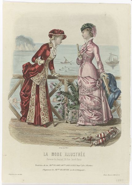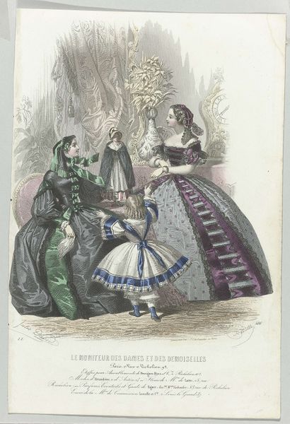 This lithograph, Les Modes Parisiennes, was created around 1864 by E. Cheffer, and printed using a process that democratized image-making during this era. Lithography relies on the chemical repulsion of oil and water. The design is drawn on a flat stone or metal plate with a greasy crayon, then treated with acid. The greasy image attracts ink, while the wet, non-image areas repel it. This printmaking technique allowed for relatively quick and inexpensive reproduction, feeding the growing demand for visual culture in the 19th century. Here, the sharp lines defining the figures and their elaborate costumes speak to lithography's capacity for detail. Notice how the process captures the soft textures of the fabrics, the intricate patterns of the dress, and the subtle shading that gives depth to the scene. This print is a testament to the power of accessible image-making in shaping social trends and desires.