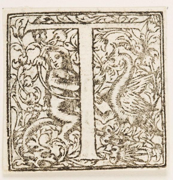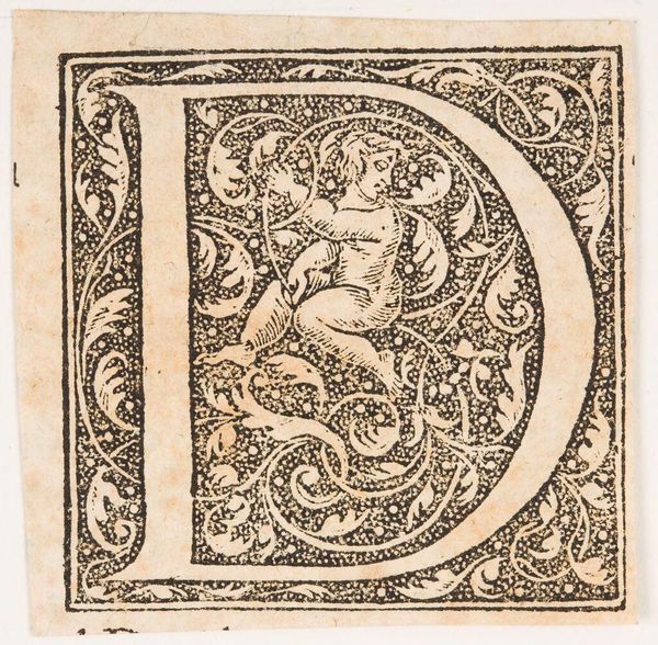 Editor: Here we have an initial, "Letter E," by an anonymous artist. I find the swirling flora and figure within the letter's form intriguing. What's your read on this piece? Curator: It's like a little world contained within a letter, isn't it? I see this as a playful nod to illuminated manuscripts. The detail is stunning—almost like peering into a tiny garden. Editor: A garden of letters! I never thought of it that way. Curator: It makes you wonder what other stories are hidden in the alphabet. Each letter potentially its own universe. Editor: Exactly. That puts a new spin on typography! Curator: Right? Art's about seeing what's there and then imagining what could be. Editor: I'll never look at an "E" the same way again. Curator: Me neither. Each letter is a portal.