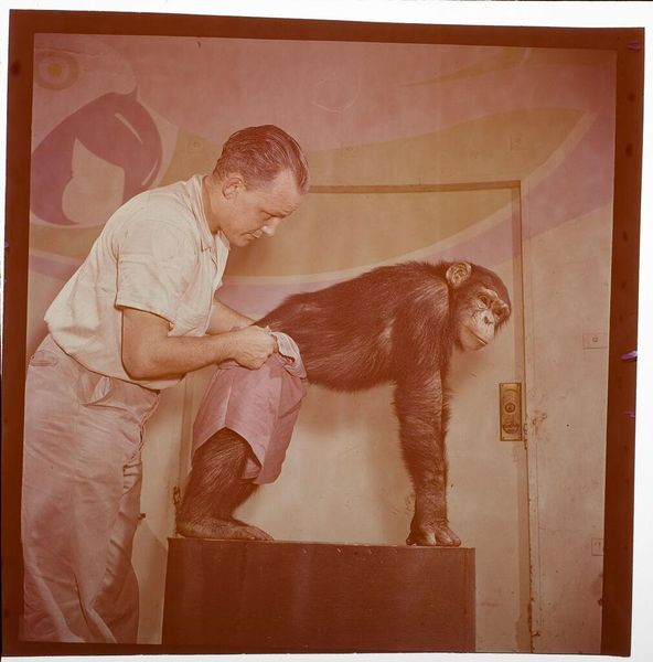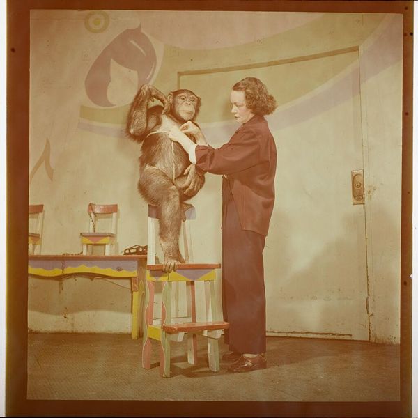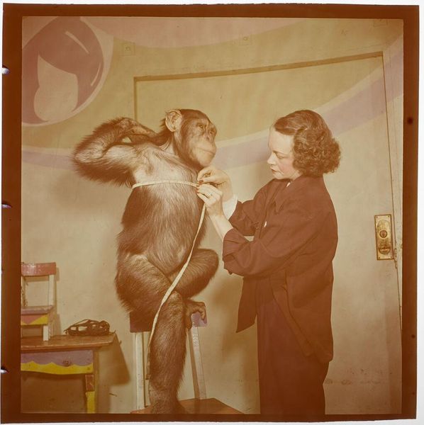 Curator: At the Harvard Art Museums, we have this intriguing photograph by Jack Gould, without a title, but showing a woman measuring a chimpanzee. Editor: The scene is unsettling, yet calm. The woman's expression is so serious, and the chimp seems almost compliant. Curator: Absolutely. It's a strange tableau. We see labor, the woman is performing a task. What is the purpose of this measuring? Is it for tailoring clothing, or some bizarre circus act? Editor: It makes me consider the historical context. The social role of animals in entertainment, the relationship between humans and primates – it all raises ethical questions. Curator: Indeed. The image underscores the constructed nature of these relationships and the commodification of both labor and the animal. Editor: It's a provocative image, leaving me with more questions than answers about its implications. Curator: Precisely, it invites viewers to contemplate labor, context, and the peculiar intersection of humanity and animal life.