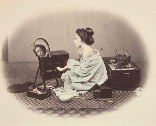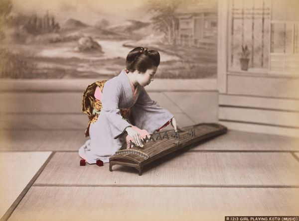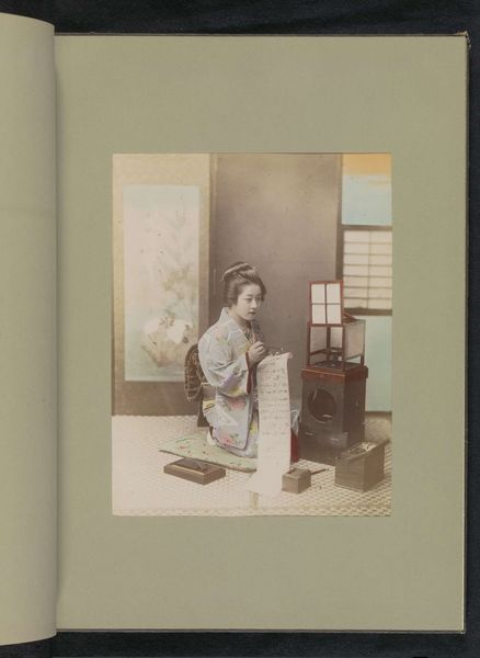 This photograph, of unknown authorship, presents a seated woman writing a letter. The composition is structured by a grid formed from the tatami mats, which are echoed in the linear patterns of the woman's kimono. Notice how the use of dark and light tones guides our eye. Dark wooden boxes anchor the foreground, while the white letter and box, centrally placed, draw our immediate attention. The fan display behind the woman provides a softer, curved contrast to the overall rectangularity. Consider how this image uses geometric forms and tonal variations to communicate not just a scene, but also a cultural and social order. The meticulous arrangement of objects and the woman's poised posture suggest themes of ritual, communication, and perhaps, regulated expression. The artist uses these formal elements to construct a narrative that invites ongoing contemplation.