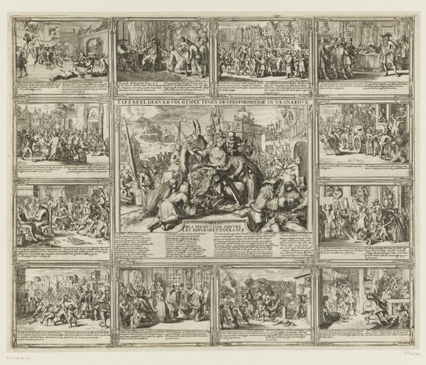 Editor: This print, made in 1691, is titled *Vlucht van Jacobus II naar Rochester en Parijs, 1688-1691.* It’s an engraving, and attributed to an anonymous artist. The division into four panels creates a sequential narrative. How do you approach a work like this with so much detail packed into such a small space? Curator: One must first consider the relationship between the individual panels. Each functions as a distinct unit, yet together they form a cohesive whole. Note the use of line: it delineates forms but also creates texture and movement, particularly in the rendering of the sea and the clothing. Observe how light and shadow, though limited by the engraving medium, define spatial depth. What structural relationships do you observe in the sequencing, if any? Editor: I notice the first three panels seem to focus on departures by sea. It could indicate the most dramatic parts of the depicted narrative? The last is on land but retains the most figures. Is the number of figures important? Curator: Indeed, the figures’ aggregation prompts us to think of them, perhaps, as a signifying mass. The variation in their posture creates an appealing formal composition. The formal repetition may echo, amplify, or contrast with the thematic thrust of each event shown in each pane. Also, consider the overall structure itself, with each view or 'take' framed, as it were. How do those borders reinforce meaning? Editor: The borders act as windows, almost, creating different scenes, but the crosshatching provides consistency across each. Are there other areas of detail that draw your eye in? Curator: The rendering of the ships – note the meticulous detail in the rigging. Further consideration needs to be made about the use of light, both literal and metaphorical, in Baroque prints to suggest moral content and larger narratives. What conclusions might one draw, simply from that, do you think? Editor: That is a helpful way to think about this type of historical artwork. Now I have more tools for my analytic lens.