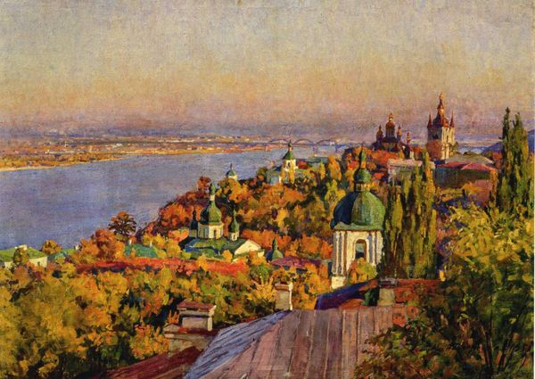 Arkhyp Kuindzhi made this view of Moscow using oil paints, likely on canvas. Oil paint, ground pigment suspended in linseed oil, was by the late 19th century a thoroughly industrialized medium. The effects here are achieved through layering and blending. Look at the way he renders the sky, not as a flat expanse but with subtle gradations. Or the reflections in the water, achieved through nuanced brushwork. Kuindzhi demonstrates mastery over the material to give a sense of atmospheric perspective. The Kremlin and Pokrovsky Cathedral in the background loom, rendered with a keen eye for architectural detail and color harmony. The painting technique itself, though seemingly traditional, reflects the evolving industrial capacity to manufacture and distribute art supplies widely. Consider the labor involved: from the harvesting of flax for the oil to the mining of pigments, a whole economy is implicated in the production of this image. And of course, the artist's own labor in skillfully applying those materials to canvas, gives his art historical significance.