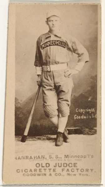 Editor: This albumen print, "Hanrahan, Shortstop, Chicago," was made around 1887 by Goodwin & Company as part of the Old Judge Cigarettes series. There’s a sepia-toned elegance to this portrait that’s striking. What historical narratives are woven into this baseball card, beyond its face value as a collectible? Curator: This isn’t just a portrait; it’s a snapshot of the burgeoning commercialization of baseball and the use of celebrity endorsement in the late 19th century. Cigarette companies like Old Judge strategically used these cards, inserting them into packs, to promote their product and cultivate brand loyalty. Who did they hope to reach with this strategy? Editor: Primarily, baseball fans, especially young ones who might be swayed by the images of their sporting heroes. But, knowing what you do about cultural context, what other layers are at play here? Curator: Consider the politics of representation. These cards weren’t just about selling cigarettes; they were about shaping an image of American masculinity, tying it to ideals of athleticism, success, and even leisure, even as anxieties surrounding immigration and industrialization were rampant. It's also telling to see which athletes were chosen, and who was conspicuously left out. The creation of "Old Judge" was at a crucial time for sports. Baseball was starting to become a cultural sensation. Editor: That gives me a different way to view what seems a straightforward photograph, almost. It underscores the subtle ways marketing and societal norms intertwine. Curator: Precisely. What appears to be a simple promotional item is in fact an intriguing mirror reflecting the social and political values of its time. We have to also realize that these images gave certain folks platforms while excluding others from recognition, making the art piece somewhat exclusionary. Editor: Absolutely, reflecting on these layered meanings reshapes our understanding and deepens its complexity beyond mere admiration. Curator: I completely agree; it's in understanding the cultural undercurrents that these pieces can show the ever changing art of human dynamics.