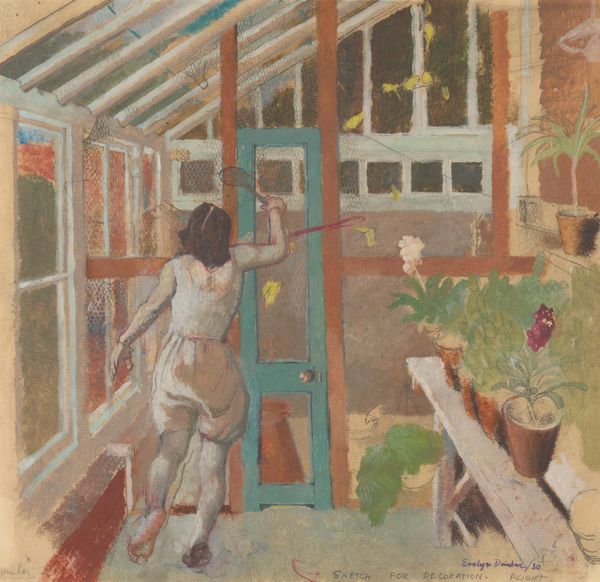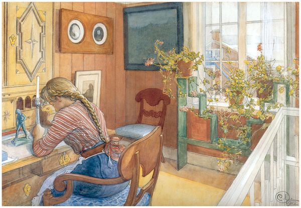 Editor: So, this is Carl Larsson’s “Flowers on the windowsill”, painted in 1894. It's a watercolour currently housed in the Nationalmuseum in Stockholm. It strikes me as a remarkably well-balanced composition. The interior domestic setting creates a serene atmosphere, but how do you see it? Curator: The composition, indeed, demonstrates a careful arrangement of forms. Note how the verticality of the window panes and the plants in their terracotta pots creates a grid-like structure, against which the curved lines of the child's form and the trailing vines provide a gentle contrast. How do these contrasting forms influence the image's affective qualities? Editor: I suppose it stops the whole scene from feeling too rigid. The curves soften it, making it more inviting. It almost has a flattened perspective. Curator: Precisely. Larsson manipulates the pictorial space, seemingly flattening the perspective to emphasize the surface pattern and the interplay of colours. Consider the subdued palette of greens, reds, and yellows – how do these choices contribute to the overall impression of domesticity? Editor: I think the limited palette really contributes to the painting's unified feeling. The colours complement each other, and guide your eye around the scene in a way that more contrast might not. Is there anything more to explore with the semiotics in this work? Curator: We can consider the signs within the domestic space and what the painting tells us. The arrangement isn’t perfectly ordered, there is space left on the table for tools that give us additional access to their lives. Ultimately, this tells us something deeper about Swedish national identity through painting. What new insight did you gain? Editor: Thinking about how the structure and forms work to build the painting’s serene atmosphere has given me a whole new perspective. Curator: It’s through close analysis that we come to a greater appreciation for Larsson’s craft and insight.