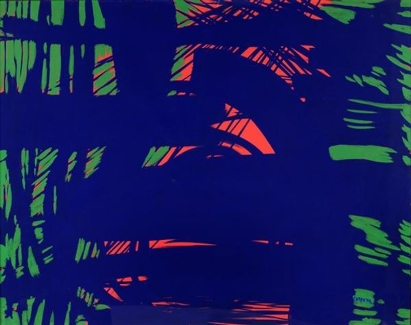 Peter Alexander made ‘Lido’ as some kind of meditation on light, and what I love is how the colours seem to bleed into each other, like watercolour dreams, but it’s paint, so how does he *do* that? It’s like he's trying to catch a memory of a palm tree, or maybe the feeling of sunshine on your skin. Look at the way the red bleeds into the yellow, so that you can almost taste that feeling of being burned. It’s so subtle but when I look, I can see the brushstrokes like soft whispers across the surface and these layers of pigment seem to glow from within, so that I can see the physical act of making, but then there’s these hard black lines, like a slap in the face, but that’s life isn’t it? Alexander reminds me a bit of David Hockney, with that whole west coast vibe, but what Alexander does is all his own, he pulls you into this space where things aren't quite what they seem, where colors vibrate and shapes shift and that for me is the magic of painting, right there.