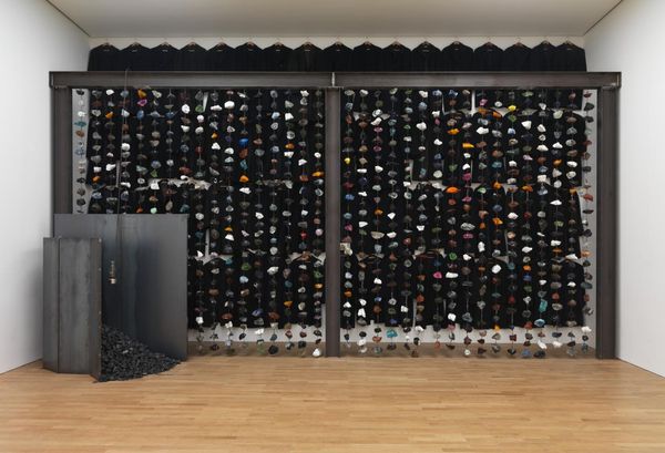 Curator: We're standing before Inigo Manglano-Ovalle's 2006 installation art piece, a site-specific work entitled "Portrait of a Young Reader." It's a mixed-media artwork prominently featuring geometric grids and abstract patterns. What's your initial reaction? Editor: It feels… pixelated, almost like a low-resolution digital image blown up on an enormous scale. The overall effect is intriguing; a strange blend of organic and technological. Curator: Indeed. Consider the grid – the matrix is strong here. It dictates the arrangement of what appear to be small, colorful disks affixed to a dark surface. How do you interpret their symbolic presence within that rigidly structured context? Editor: Immediately, they recall stained glass to me, albeit modernized. They remind me of educational institutions, like childhood memories or maybe a motif related to memory itself or learning through iconography. Does that resonate given the title of the piece? Curator: Absolutely. The artist likely employs the geometric framework, those structured arrangements of modules, as a visual metaphor. Consider the act of reading – constructing meaning from individual textual units – words and letters – that fit within a larger grammar of narrative. Editor: Precisely. The colours are interesting. Note how red and green dominate—almost signaling the start of intellectual growth, perhaps like gaining independence? Are we reading too much? Curator: A reading should never be “too much” if the structural supports offer something compelling in return. Colour as a signifier always holds interpretive weight in contemporary iconography. The strategic arrangement implies the presence of data or encoding, thus suggesting intellectual maturity, or possibly the pathways that form and guide learning. Editor: It all comes together in such an interesting way. So is it a face, is it code? Curator: Well, that is what the art invites one to ask. Hopefully we provided one path for getting there. Editor: The discussion has definitely allowed a deeper connection to what could have been an arbitrary visual. Thank you.