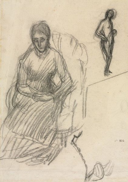 This is Édouard Vuillard's sketch of a young woman, made with pencil on paper. You can see a kind of searching in the marks. It's like Vuillard is thinking through the subject, letting the pencil wander and find its way. The texture of the paper comes through; it feels intimate, like a glimpse into the artist's studio. The lines are delicate, almost tentative, but there's a sureness there too, especially in the way he captures the fall of light on her dress. I'm drawn to the loop-like mark near the bottom – is it a stray line, a doodle, or a crucial part of the composition? It's this ambiguity that keeps me looking. Vuillard reminds me a bit of Bonnard, both artists had this way of making the ordinary feel extraordinary. It's a reminder that art isn't about perfect representation, but about seeing and feeling.