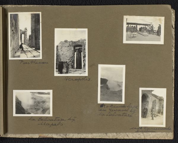 Curator: Carolina (Loentje) Frederika Onnen’s “Vijf foto’s van een reis naar de Elzas,” dating from 1927, presents us with a page from what appears to be a personal sketchbook or travel journal incorporating mixed media and photography. It has such a story to tell just visually. Editor: It absolutely does. My first impression is one of faded memories, like holding a tangible moment from a bygone era. The sepia tones and small format—it almost whispers secrets of a simpler time. I am so drawn to it Curator: Yes, the "aged paper," and "muted color palette," certainly evoke nostalgia. The page incorporates five albumen prints, likely personal snapshots from Onnen's trip, each captioned with handwritten notes detailing locations like "Sainte Baume," "Kaysersberg," and "Le lac noir." It’s a fusion of personal experience and artistic documentation. The handwriting provides additional historical insight, a charming informal reflection of Onnen's experience and the specific Elzas locations. Editor: It’s amazing how handwriting makes everything feel intimate, like you are discovering the secrets held within the location. As I glance around the sketchbook, it has an intriguing, scrapbook-like arrangement of snapshots with handwritten captions beneath the photographs creating an interplay of visual and textual memories. Curator: It is more than an aesthetic presentation of location it's like creating and controlling the image the general public get to see, very much a tool for impression and to curate specific experiences for public eyes. A control for image circulation. I see also an act of self documentation. The act of touring then photographing. A social statement, or act for the bourgeois? A memory saving process of status showing and control in the sense that by keeping only this memories in particular we omit or hide from self and/or from the world things, experiences, faces and places. Editor: True. As a creative act it might also be a selection. It’s fascinating to think about which stories she chose to capture and immortalize through photography and carefully written descriptions. As artists we do leave parts of our lives on paper, and by that also create room for more by not thinking of these. Curator: Very true. Ultimately, this sketchbook page encapsulates not only a journey through Alsace but also the subjective act of documenting and curating memories. Editor: It is true, you can even glimpse Onnen herself, standing near architectural structure with a calm aura around her and the pictures as a whole. For me it's more than a preservation effort, I'm almost reminded of the idea of "The Gallery of the Self" of making it and reflecting it so well it almost feels real.