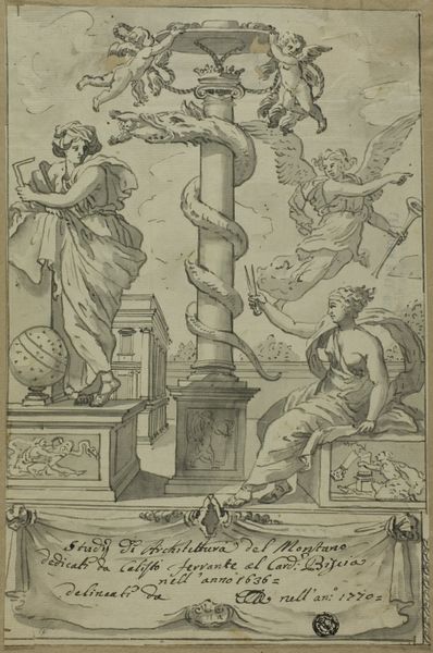 Curator: Oh, what an intriguing find. This is a page from a sketchbook dated to 1619. The complete book is titled "Blackwork Ornament with Two Sawing Men in a Sketchbook with 131 Prints." Editor: My first thought is... slightly absurd, isn't it? I mean, those sawing men! The contraption itself is so ornately decorated, like some precious, over-engineered toy. And is that a massive cricket hovering? Curator: Exactly! That's what draws me in – the juxtaposition. You've got this incredibly detailed scene of manual labor, but the execution is, dare I say, almost whimsical. Jean Toutin's use of engraving creates a fascinating tension between the practical and the purely ornamental. Look at how he renders the textures, from the wood grain to the delicate floral patterns on the saw frame. Editor: Yes, the engraving is superb. Notice how Toutin’s technical skills are used to monumentalize a common trade like carpentry. Also note the men at work, elevated in a strange symbiosis as the fruits of their labor pour into a vessel at the center of this operation. What I love is the emphasis on this ornamental contraption that mediates their hard labor. We should also make the case that images like these were part of a vibrant print culture in the Northern Renaissance, which really spurred circulation of aesthetic and technological ideas in workshops. Curator: Absolutely. It’s as though labor itself has been elevated to a form of art. I keep circling back to that cricket, though. It is such an odd element; it could be a symbol of… well, who knows? The impermanence of things? A pesky annoyance in the otherwise diligent process of craftsmanship? It makes you wonder about the intention. Editor: Right? And in many ways, this speaks to your earlier comment of whimsy; but whimsy has concrete ends! A printed engraving for sale serves material and social goals to disseminate aesthetics and possibly techniques as commodities. Its art status makes the final piece more attractive in ways that the two sawing men will not. Curator: So well said. It really showcases the genius of the artist in capturing what is so simple with so much complexity. What a moment. Editor: This pushes us to see value in the often under-examined elements and relations of the material world. Definitely intriguing!
