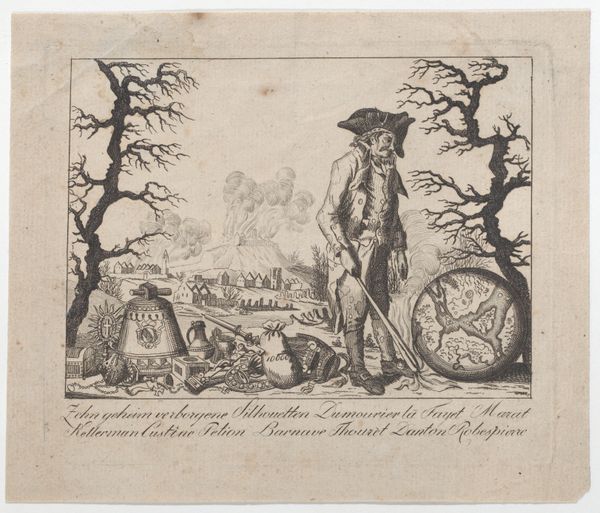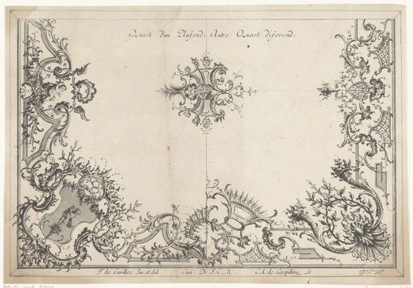 Curator: This delicate pen, etching and engraving print is titled "Proposal for Engraving by Subscription From an Original Picture Painted by Zuccarelle." It's by William Austin, dating back to 1756. Editor: Ah, a landscape framed by what seems like architectural ruins. There's a wistful, almost melancholic feeling about it, don’t you think? Curator: I agree, it has a picturesque quality that speaks to the 18th-century fascination with ruins and the romanticizing of nature. What’s interesting is its purpose. This wasn't intended as a standalone work of art, but rather as an advertisement, if you will. Editor: A sales pitch masquerading as art? I like it. The framing feels very performative then, almost theatrical, like unveiling a grand spectacle that needs subscribers, patrons eager to buy into the fantasy. Curator: Precisely! Austin is essentially advertising a future print based on a painting by Zuccarelli, and using this detailed engraving to entice buyers. The text inscribed within the image outlines the proposal terms, detailing sizes and payments. Editor: So it's a piece of marketing ephemera? The landscape at the heart is serene. There is a lone rider going along a river. Despite that one active element though, the piece seems like an ode to memory more than a picture of progress, highlighting both natural and architectural decline in such decorative style. Curator: Exactly. Look at the blend of promotional text with allegorical motifs. By combining utility with artistry, Austin elevates his advertisement. This tells us so much about the relationship between art, commerce, and audience expectation in the 18th century. Editor: It’s remarkable how something so explicitly transactional can still evoke such a mood. A smart way of blending artistic expression with economic realities! A call for support cloaked in the picturesque beauty it promised to deliver, literally! Curator: Right? A poignant blend. An ode to what *was* that reminds us how inextricably linked art, the market, and nostalgia can be.