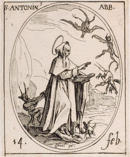 Curator: This is Jacques Callot's "Saint Patrick," a small but striking etching from the early 17th century, currently held at the Harvard Art Museums. Editor: It's intensely active, isn’t it? The swarm of snakes tumbling off the cliff is so dramatic, despite the miniature scale. Curator: Yes, Callot captures the expulsion of snakes from Ireland, a core element of Saint Patrick’s iconography. Notice how the saint gestures commandingly towards the reptiles. The snakes, of course, symbolize paganism, driven out by the saint's faith. Editor: That hat seems a bit much, though. Sort of clashes with the severity of the event, doesn't it? Like fashion interfering with the divine plan. Curator: Perhaps, but the hat is another part of the Saint’s visual identity. It shows continuity with the church and its teachings. Editor: Even so, I can't help but feel this small etching contains a universe of symbolism, culture, and maybe a bit of dark humor, all cleverly tucked into a tiny frame. Curator: Absolutely, and understanding these visual cues allows us a deeper understanding of how history, faith, and cultural identity are conveyed over time.