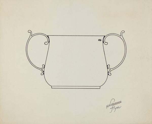 Curator: The simplicity of this pen drawing, labeled "Silver Tankard," just washes over me with such serenity. Editor: Interesting! The year, circa 1936, places this piece squarely in a period grappling with economic depression and the rise of industrial design. Its rigid, geometric forms suggest function over frivolity, but I wonder what "Silver Tankard" signifies about this artist Lawrence Flynn's aspirations or intentions, at a moment when many were facing harsh realities? Curator: A moment of reflection, I imagine. It is almost an idealized vessel of quiet comfort. Its lines are clean, precise... confident, even. Flynn probably didn't produce the piece on spec for some architectural patron. What sort of commissioner during The Depression would require or authorize such a rendering of metalwork, even for architectural illustration? It almost feels personal, doesn’t it? A desire rather than a documentation? Editor: Perhaps. I also read its meticulous, even technical linework in a historical light: there's a real precision, the stark lines capturing both the form of the tankard while somehow withholding a depth of lived experience or feeling. Did this kind of drawing reflect an interest in mass manufacturing techniques in the art world at the time? Was there perhaps a link between industry and artistic expression we have missed? What materials did the artist need, and from what location would those need to come? Curator: Absolutely! One thing to keep in mind: "Silver Tankard" transcends time, speaking both of streamlined simplicity and historical context. I mean, is there even another object one might prefer? It looks ready for some really dark stout to flow… the sort of stuff that sticks to the mustache… I'm waxing nostalgic all of a sudden! Editor: A bit on the sentimental side, are we? Still, your sense of yearning seems apropos. Perhaps this glimpse into the past does evoke a sense of desire—not just for a cool tankard of ale but perhaps a desire for a more streamlined and well-crafted life. Or, if not more well-crafted, maybe the chance to appreciate things whose crafting took work, time and effort?