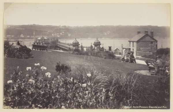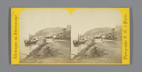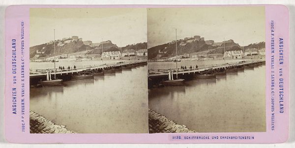 Curator: Ah, I'm immediately drawn in. There's something incredibly melancholic and dreamlike about this early photograph, isn't there? Editor: Indeed. This albumen print, entitled "Gezicht op Fort Ehrenbreitstein in Koblenz," capturing a view of Fort Ehrenbreitstein in Koblenz, dates back to somewhere between 1859 and 1875 and it’s the work of Theodor Creifelds. Curator: That creamy sepia tone just washes over you, doesn't it? It gives the entire scene an air of quiet contemplation. I feel like I could almost step onto that pontoon bridge and disappear into the mist of time. It makes me think about history in layers, like sediment building up in the Rhine river it depicts. Editor: The albumen process certainly lends that romantic air. Notice how the figures on the bridge seem almost incidental. They’re there, yet they're absorbed by the monumental scale of the fort itself, representing steadfast power looming above and beyond. The symbolic relationship to nature—the imposing edifice atop its geographic plinth. Curator: That’s true; they almost fade into the background. To me, they are there to be framed in their historical moment: a glimpse into their time versus ours. And the reflection of the fort in the water…it's like a mirror reflecting both reality and a submerged history that is fading even as it is revealed. Editor: There's an interesting ambiguity too, that perhaps underscores something profound. Is the focus really on the majestic stronghold, or is Creifelds equally drawn to the everyday moment, the human element as it briefly occupies the foreground? Curator: That's precisely why I keep getting drawn back in! It’s the relationship between these realms, I guess; like those fleeting figures passing between time-altered stone and forever-flowing river! They connect it all. A gentle nudge in how you remember time. Editor: Photography had its way, didn’t it? From romance, to reality. What a moment frozen. Well, thank you, friend! That was time very well spent. Curator: Yes, thank you, a nice stroll through someone else's moment and thought! It was simply great.
