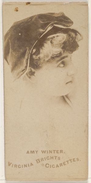 Curator: This is "Card 428, Daisy England" from the "Actors and Actresses" series, created by Allen & Ginter between 1885 and 1891. It’s an albumen print, originally a promotional card for Virginia Brights Cigarettes. Editor: It has such a dreamy, ethereal quality. The soft sepia tones give it an antique feel. The way Daisy is looking off to the side, with her hands clasped under her chin—there's a sense of longing, or maybe quiet contemplation. Curator: Indeed. These cards were a phenomenon. Allen & Ginter understood the rising popularity of celebrity culture, and these cigarette cards depicting actresses, athletes, and other public figures became hugely collectable. Editor: What's fascinating is how these cards participated in constructing an ideal of femininity at the time. Look at Daisy’s delicate features, her slightly averted gaze – it fits within that late-Victorian archetype of the demure, beautiful woman meant for consumption and admiration. The objectification is subtle, but there, considering it’s tied to selling cigarettes. Curator: The format itself is revealing. Mass production made these images accessible, circulating and standardizing images of beauty, while subtly associating it with consumer products and leisure. Virginia Brights used popular actresses like Daisy England to appeal to a wide audience, turning a portrait into a tool for commodity circulation. Editor: It’s important to remember the cultural context: cigarettes were marketed heavily to women around this time, associating smoking with independence and sophistication, while simultaneously, women like Daisy England were exploited for the male gaze, thus making it a multi-layered gendered artifact of this era. How passive she looks feeds into the commodification process. Curator: Exactly, and what’s brilliant about considering this work is unpacking the subtle interplay of public image, consumerism, and gender expectations, all wrapped into a small cardboard card. It serves as a historical marker that speaks volumes about that particular moment in history. Editor: I’m walking away from this, thinking about the politics of image making, especially when women’s bodies are involved. We need to critically examine how representations perpetuate cultural norms and the underlying messages about female identity. Curator: A potent reflection to consider given the context in which it was initially conceived, making one see both art and the wider world differently.