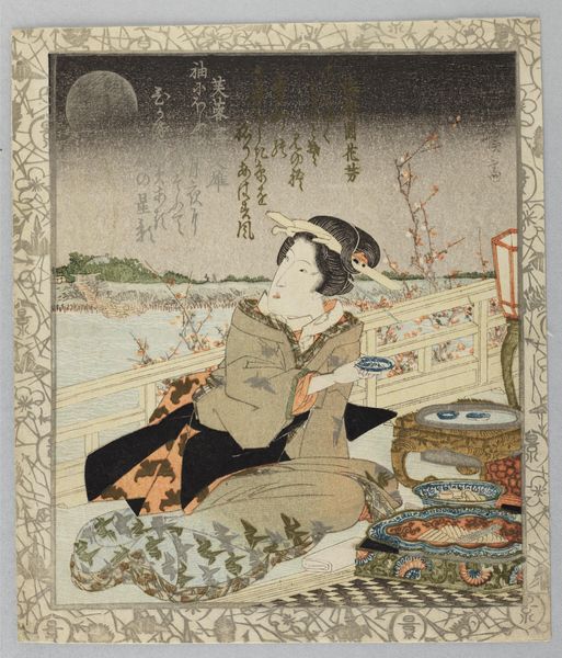 This print, *Woman Catching a Packet*, was made by Utagawa Kunisada in Japan using woodblock printing, a technique known as *ukiyo-e*. The image shows a woman on a boat, reaching up to receive a packet, perhaps containing a letter or some other important communication. The process begins with a drawing, which is then transferred to a woodblock, usually cherry. A carver meticulously cuts away the areas that will not be printed, leaving the design in relief. Different blocks are used for each color, requiring precise alignment. The blocks are then inked and pressed onto paper, one color at a time, building up the final image. The flat, graphic style and clear, bright colors are typical of ukiyo-e prints, which were produced on a commercial scale, meeting a demand for accessible, popular imagery. These prints challenge the divide between art and craft, being both carefully designed and skillfully made, yet also existing within a system of production and consumption. The work celebrates the artistry inherent in everyday life.