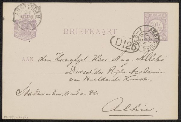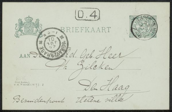 Curator: Here we have “Briefkaart aan Philip Zilcken,” a postcard from the Rijksmuseum's collection, believed to have been produced sometime between 1903 and 1918. It's ink on paper. Editor: My immediate impression is one of bygone days – the slightly faded ink, the postal stamps, the careful script… it feels like holding a tiny, tangible piece of history. Curator: Precisely. Let’s consider this from the viewpoint of production and social exchange. This wasn’t just about sending a message. Paper quality, the choice of ink – even the act of physically writing reflects a specific labor process. The materiality of it is significant in and of itself. Editor: I am much more drawn to the layers of encoded imagery and the symbols of statehood displayed on it. The postmark, for instance, with its coat of arms and "Je Maintiendrai" motto, speaks of a civic identity rooted in history. There's also the calligraphic styling itself, which is rife with significance. It conveys layers of meaning through subtle stylistic variations. Curator: I see the importance of imagery, yet I argue we shouldn’t forget how these postcards acted as crucial elements in a communications network – binding people across geographic expanses and across varied socio-economic positions. Its materiality determined, at least to some degree, who could produce and access them. The postal infrastructure facilitating exchange and commerce should not be omitted. Editor: Still, it all hinges on decoding visual signs! Look closely: we must consider this postcard as more than an object; instead, view it as a portal transporting cultural memory. It shows handwriting styles valued in Dutch culture at the turn of the century; there are symbols signifying identity… all interwoven in layers accessible to those prepared to decipher them. Curator: Agreed, there are stories hidden in the design, but the object as a material artifact carries just as rich of meaning when considered a product of industry that also shaped consumer habits in that era. We cannot divorce these signs and symbols from a larger context related to production, availability, and exchange. Editor: I believe this brief look has underscored how deeply imagery influences, constructs, and conveys messages that last across eras, whereas you've emphasized how deeply they mirror prevailing methods of mass-communications production during particular times. Curator: It seems the convergence lies somewhere between recognizing historical forces influencing image production and understanding meanings such objects carried in everyday communications systems.