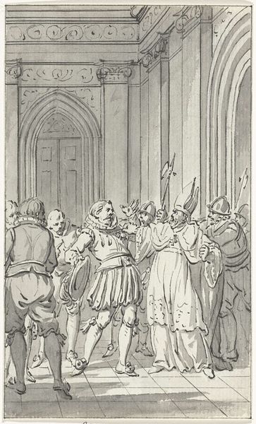 This pen and ink drawing by Jacobus Buys depicts David of Burgundy, the Bishop of Utrecht, stripping Reinoud II of Brederode of the insignia of the Order of the Golden Fleece in 1470. Buys, working in the late 18th century, was deeply involved in the Patriot movement, a period of political unrest and calls for democratic reforms in the Dutch Republic. The drawing captures a moment of high drama and political intrigue from the late Middle Ages. Reinoud II, surrounded by onlookers, is confronted by the imposing Bishop, who removes the chain of the Order of the Golden Fleece from his neck. The act of stripping Reinoud of his honors is heavy with meaning, marking a profound loss of status and belonging. The image resonates with themes of power, justice, and the potential for abuse within hierarchical structures. This is especially interesting because the artist was interested in hierarchies of power in his own time. The drawing then, invites us to reflect on how symbols of power and status can be both conferred and taken away, reflecting the shifting sands of political fortune.