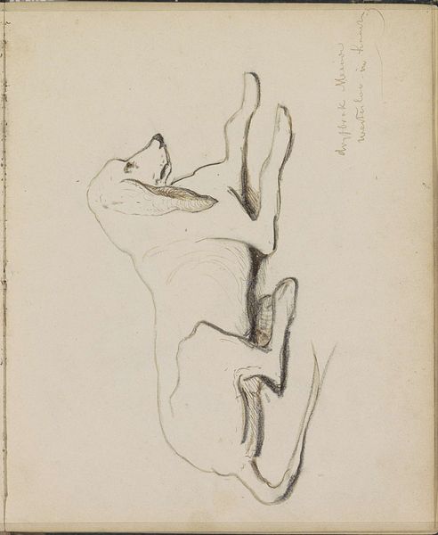 Curator: Here we have Johannes Tavenraat's "Liggende Hond," a pen and pencil sketch dating from somewhere between 1841 and 1848, now residing here at the Rijksmuseum. Editor: What immediately strikes me is its relaxed, almost languid pose. The animal is presented vulnerable, belly-up – a surprising depiction of domestic trust. Curator: Indeed. The sketch itself is deceptively simple. Note how the artist employs a minimal, almost ephemeral line to define form. There’s a clear economy of means. Editor: I see an appeal to sentimental values. Dogs have been potent symbols of loyalty and companionship across many cultures for millennia. It could be a visual reminder of idealized relationships between humans and their animal companions. Curator: Interesting perspective. Structurally, the light pencil work allows our eyes to complete the form, actively engaging with the artwork. The dog's posture breaks conventional constraints within the rectangular form, extending out to touch all edges and creating dynamic tension within the composition. Editor: The upturned posture of the dog also presents a motif of vulnerability, of an almost childlike innocence that could provoke within the contemporary viewer the need to care for someone, or some-thing, other than oneself. Curator: A provocative reading, given the socio-economic structures of the period. One sees how the drawing explores visual balance without heavy lines, inviting questions about perception, surface, and the barest definition of the real. Editor: It certainly encapsulates the values that audiences prized when genre painting dominated artistic expression; simple but highly charged symbols related to domestic life and accessible emotion. Curator: Ultimately, Tavenraat gives us more than a portrait; the artwork provides a space to contemplate, an opportunity to consider the power of simplicity in artistic expression. Editor: And through such seeming simplicity, we can come to see potent symbolism across cultures related to loyalty, trust, and emotional connectivity between humans and the animal kingdom.