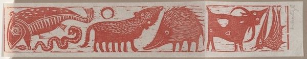 Helen Siegl created this woodcut print of concentric circles, a goose, and a fish. The composition arranges these three forms vertically, each rendered in dense black ink against a textured, muted red background. This rustic materiality invites us to consider how simplified forms can evoke a sense of depth. The stark contrast between the black figures and the red field accentuates the basic shapes: a spiraling circle that appears celestial, a stately goose with patterned wings, and a fish covered in scales. This visual vocabulary suggests a symbolic language, where the objects become signs within a broader structuralist framework. The arrangement of these figures is not accidental; it's a deliberate construction that invites interpretation. Consider how Siegl challenges conventional perspectives by flattening the images. It's clear that this is more than a simple depiction of animals; it's an exploration of form and symbolism that resonates with both visual and intellectual inquiry.
