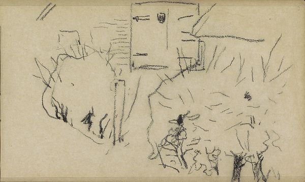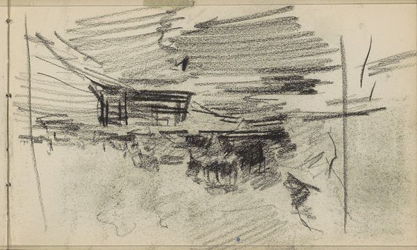 Editor: We're looking at Willem Witsen's "Winterlandschap met gebouwen," created sometime between 1893 and 1897. It's a pencil drawing currently housed at the Rijksmuseum. It has such a stark, almost desolate feeling to it. What visual elements do you think contribute to this atmosphere? Curator: The overall tonality certainly dictates that immediate emotional reading. The restricted palette of graphite on paper, combined with the seemingly unfinished nature of the sketch, immediately establishes a sense of sparseness. Note how Witsen employs hatching and cross-hatching, not to create depth or volume in a traditional, illusionistic way, but rather to define the structural form. Consider the almost brutal simplicity of the architectural forms: how does Witsen reduce them to mere geometric suggestions? Editor: So, it’s less about representing the scene realistically and more about exploring its fundamental structure? Curator: Precisely. Observe the bare tree on the left and how its skeletal branches reach into the scene, echoing the angular lines of the buildings. Witsen presents not a picturesque winter scene, but an almost abstracted study of form and line. This reduction evokes a sense of isolation inherent in the landscape, and it could be considered an intellectual study of its underlying order. The artist focuses attention away from illusionism, prompting an analytical rather than an emotional response. The buildings in space relate and speak to one another without referencing the social space outside the artistic endeavor. Do you see how the lack of detail directs us toward an appreciation of pure compositional elements? Editor: Yes, I see that now. I was initially drawn to the mood, but understanding the formal choices provides a richer way to interpret the piece. Curator: Indeed. By recognizing the visual techniques at play – the stark contrasts, the linear emphasis – we move beyond a simple appreciation of subject matter toward an engagement with Witsen’s artistic process and intentions.