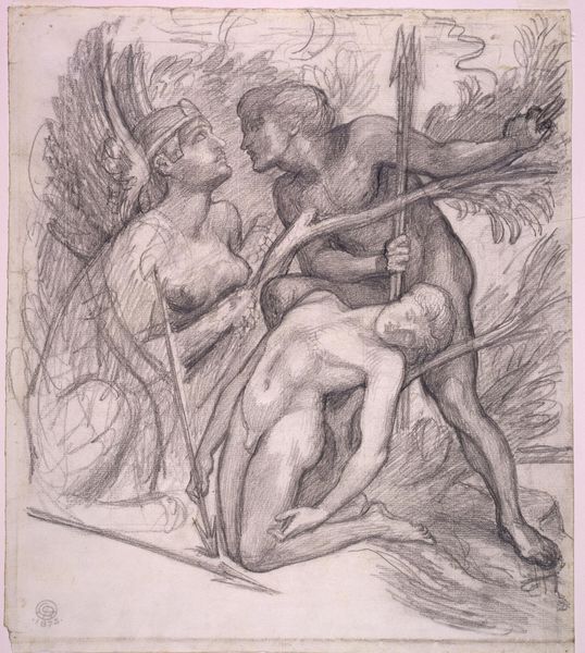 Editor: Here we have Pierre Henri's "Two Figures in a Landscape, Study for 'The Bathers'". It's a reddish chalk drawing, and I'm immediately struck by the figures' classical poses. What's your take on this piece? Curator: I see the social context of artistic production quite clearly here. The artist's choice of chalk as a medium points to a specific economy of art-making; it's cheaper and quicker than oils, allowing for greater experimentation and preparation for larger works. How does this affect our interpretation? Editor: That's fascinating! So, the medium itself reflects a certain accessibility, even within classical themes? Curator: Precisely. Consider the labor involved – the ease of use contrasts with the academic subject. Do you think it democratizes the artistic process at all? Editor: It’s a great point. I hadn't considered how the materiality and process challenge traditional ideas of high art. Curator: Indeed, the tension between the material and the subject is key.