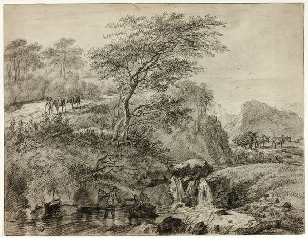 Editor: So, here we have Abraham Genoels’ "Landscape with a Sarcophagus in Ruins," probably created sometime between 1640 and 1723. It’s an etching, a very detailed little print. I find it quite melancholic; the ruined sarcophagus amidst this idyllic landscape. What do you see in this piece, what stands out? Curator: The ruined sarcophagus indeed anchors a theme deeply rooted in cultural memory. The Baroque era was fascinated by classical antiquity. Here, we see that fascination coupled with a poignant awareness of time’s passage. The ruin, a potent symbol, speaks volumes. Notice how it juxtaposes with the lively trees, the flowing water, and even figures on the bridge? Editor: Yes, the contrast is striking! Is it about the ephemeral nature of human achievement against the backdrop of nature’s enduring power? Curator: Precisely! The sarcophagus itself, once a vessel of veneration and remembrance, is now fractured. Its symbolic power, though diminished, persists. The flowing river, the growing trees – they become symbols of continuity. Does this contrast evoke a feeling of despair, or something else entirely? Editor: Perhaps not despair, but a sense of acceptance? Like, even in ruin, there’s beauty and life. The details—the foliage, the way the water reflects light—almost romanticize the decay. Curator: I see it too. There is something incredibly potent in the act of framing that ruin within an otherwise thriving natural setting. What does it mean when something sacred or honored becomes part of that ongoing, natural process? Editor: It makes you think about the stories we tell, and how even those stories change and erode over time. It's a cycle. Curator: Indeed, and art becomes a vessel, not unlike that sarcophagus itself, carrying those evolving stories through generations. Thanks to your observation I appreciate even more deeply how it intertwines loss with the persistent current of life! Editor: It’s fascinating how a simple landscape can contain so much meaning!