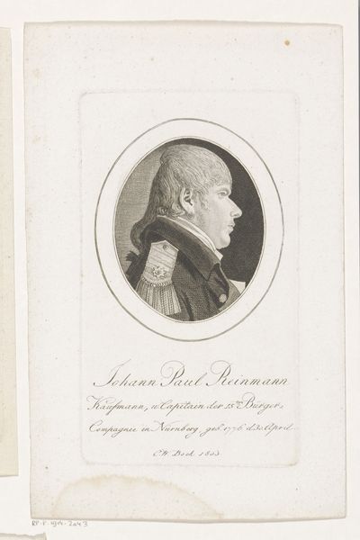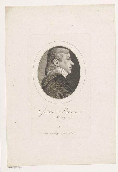 Here is the audio guide script for "Portret van Nicolaus Sörgel": This is Christoph-Wilhelm Bock's "Portret van Nicolaus Sörgel," created in 1803 using etching, and now held at the Rijksmuseum. The portrait presents a profile of Nicolaus Sörgel encased within an oval frame, a stark contrast against the rectangular paper. Notice how the meticulous use of lines creates delicate shading and texture, defining Sörgel’s features and clothing with precision. The composition directs our gaze toward the profile, emphasizing a formal and perhaps idealized representation of the sitter. Bock’s etching here functions almost as a semiotic encoding of social status and identity. The lines forming the portrait do more than depict; they communicate a certain cultural understanding of the sitter, his era, and the artistic conventions of portraiture. This detailed etching thus exists as a site where aesthetics and cultural narratives meet.