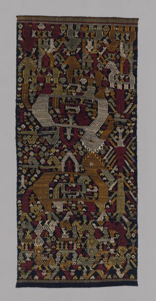 Editor: Here we have "Border Fragments," a textile carving by the Nazca people, dating from around 100 to 200 AD. Looking at it, I’m struck by the use of vibrant colors against the dark background. What stands out to you about this work? Curator: This fragment speaks volumes about the societal and political complexities of the Nazca culture. Textiles, particularly those with complex iconography like this one, were not just decorative; they were powerful conveyors of status, religious belief, and social narratives. The fragmented nature also tells a story, hinting at potential colonial violence, cultural loss, and the struggle for indigenous representation. How might the imagery here have functioned as a form of resistance? Editor: I see geometric figures and what look like mythological beings repeated throughout the pattern. Does that repetition mean something significant? Curator: Absolutely. Repetition can be a tool to amplify meaning and instill cultural values. These figures, rendered with such precision and artistry, might represent deities, ancestors, or cosmological principles. Understanding their stories helps us piece together the worldview of the Nazca, and challenge Western-centric perspectives on history. What role could they have played in ceremonial or ritual contexts, reinforcing the social hierarchy and cultural cohesion? Editor: So, it's less about simple decoration and more about encoding vital cultural information? Curator: Precisely. And recognizing that elevates our appreciation for the ingenuity and resilience of the Nazca people, and allows us to see the political dimension inherent to their artistry. Editor: That makes me think differently about the role of art in early societies. Thanks! Curator: It is essential to keep interrogating these art pieces, always mindful of how they challenge dominant historical narratives.